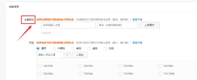 四、产品的主要颜色就是产品的sku这一块,这个可以根据产品来设定,这个颜色的话可能可以增加产品的曝光度,尺码的话是根据卖家的产品来设定